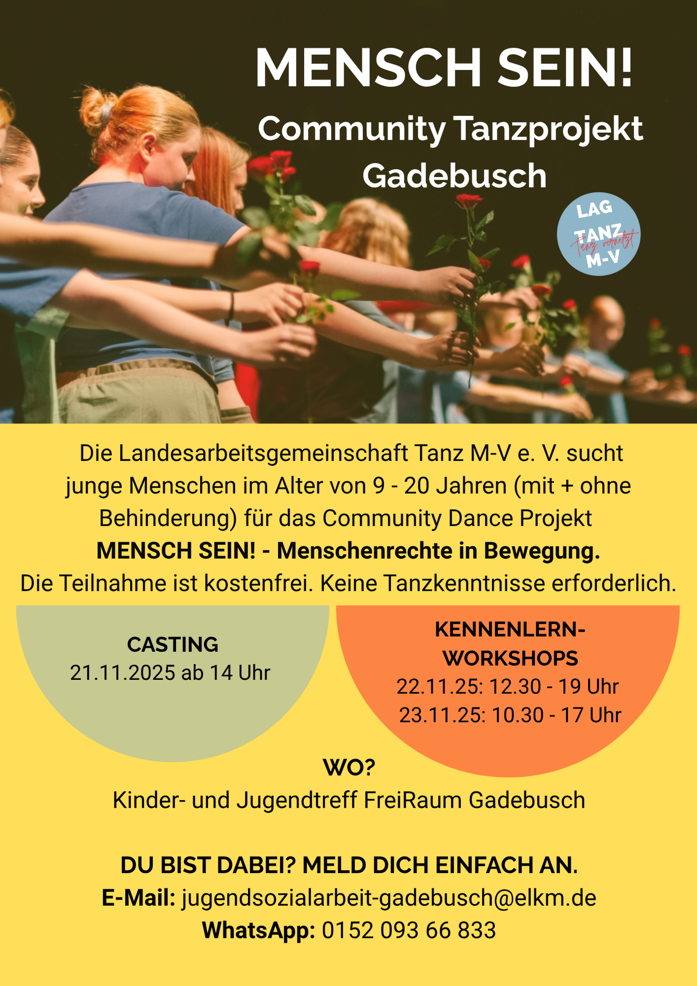 Gemeinsam mit jungen Menschen im Alter von 9 bis 20 Jahren entstehen ab November 2025 in Gadebusch bewegte Szenen und Choreografien, die sich mit dem Menschsein beschäftigen. Inspiriert vom musikalischen Werk "HUMAN" von Helge Burggrabe und dessen Bezug zur UN-Menschenrechtscharta, bringen die jungen Menschen ihre ganz eigenen Themen in Bewegung.