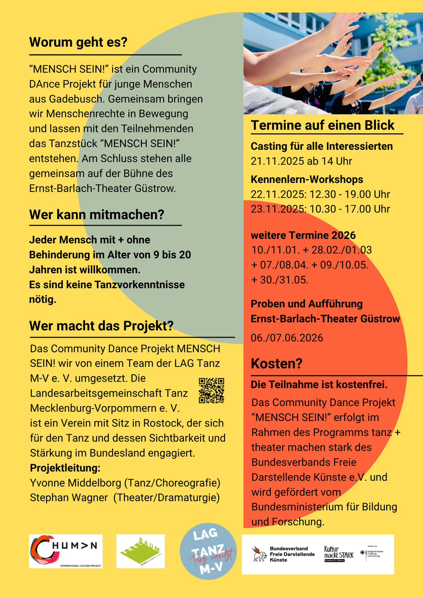 Das Community Dance Projekt "MENSCH SEIN!" wird umgesetzt von der Landesarbeitsgemeinschaft Tanz Mecklenburg-Vorpommern e. V. in Kooperation mit dem Kinder- und Jugendtreff FreiRaum Gadebusch und dem Ernst-Barlach-Theater Güstrow.